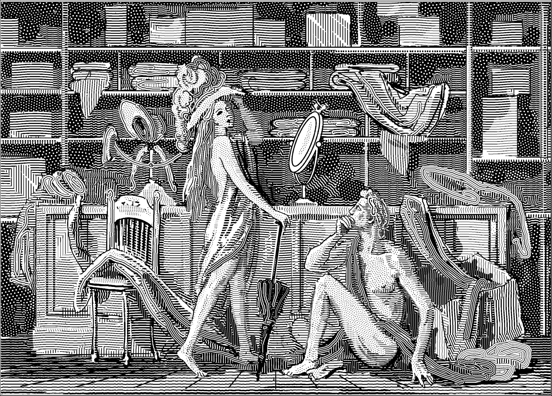Of course, in all these cases our narrator continues to make his sportive critical comments on “our present state”: Who would think of turtle soup as food? Unlike us, Adam and Eve enter the church not merely to show off their new clothes! Money is just paper! But surely we are entitled to notice the actions of the characters as well as the narrator’s comments, and to give those actions weight. For there is much artifice the new Adam and Eve encounter that is attractive to them even in their natural simplicity, and much in civilization that speaks to their deepest inclinations, both material and spiritual. We see a broad arc to the journey of the new Adam and Eve if we step back from it with the thought that art and nature are not simply opposed. Thus, at the first site they visit, the dry goods store, the new Adam and Eve expose the complicity of art and human nature when they adorn themselves not out of modesty but out of delight in their appearance to each other. No snake and no apple are required for the new Adam and Eve to cover themselves. As noted above, Hawthorne only emphasizes the difference between his story and the biblical version when, at the midpoint of their journey, the mansion, it is the new Adam who offers the new Eve an apple that she eats with no dire consequences, the apple being immediately recognizable to them as natural food. The deep interpenetration of nature and artifice in the household — a building, indeed, where the most natural of needs is met through art: the need for shelter — makes it hard to distinguish which we are seeing, and yet after the new Adam and Eve’s moment of reflection it also intimates their commonality with those whose domain they are exploring.