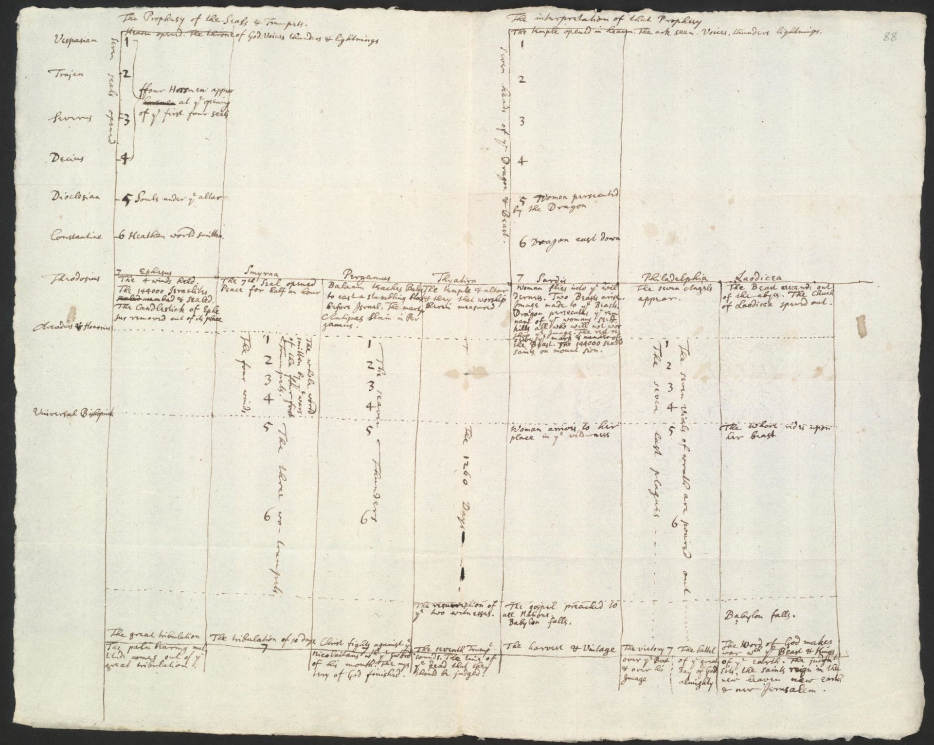 There is a rather curious item among the papers of the philosopher John Locke. Scrawled on a single sheet archived with his personal manuscripts at the University of Oxford’s Bodleian Library, it is a chart with seven columns of five to six vertical registers apiece. Locke’s note on the reverse gives the year as 1691. But the handwriting on the chart itself is Isaac Newton’s. Its contents? Not mathematics (although there are proportions and numbers), not political theory (although political figures are named), not a précis of empiricism (although it is exceptionally empirical in its own way), but the Apocalypse — the Bible’s prophetic grand finale. To be more precise, this little document is a time chart depicting how the various dramatic prophecies of the book of Revelation have been and will be fulfilled in history through the guidance of divine Providence.