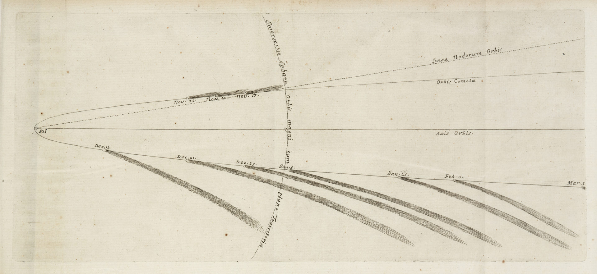 The 1713 edition of the Principia contained even more material on the dynamic cosmos not included in the first. Newton reasons (in Book Three, Proposition XLII) that because of the large number of comets, their tremendous distance from the sun at their farthest points from it, and the great length of time spent away from the sun, “they should be disturbed somewhat by their gravities toward one another,” resulting in alterations in the shape and periods of their orbits. About the comet of 1680 (which Newton personally observed with his telescope) and its extremely close approach to the sun, Newton writes that the sun’s gravitational force sped up the comet when it neared the sun, whose atmosphere then slowed down the comet, drawing the two bodies slightly closer together. (This also shows that friction, not just gravity, contributes to his dynamic universe.) Newton imagined that the comet, in repeating this pattern, “approaching closer to the sun in every revolution … will at length fall into the body of the sun.” Newton continues that, when the comet is farthest away from the sun,