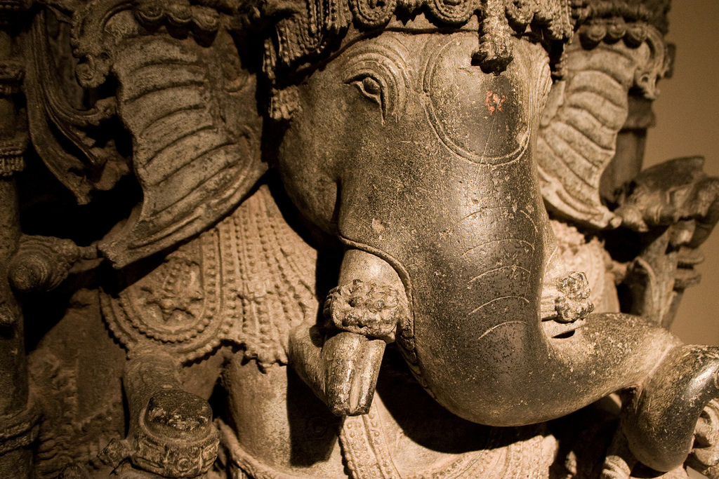 Elephants figure in some way in a number of religions, more centrally in areas of the world where they are native. The elephant is considered a totem (sacred ancestor) in many African cultures. The Koran contains a Chapter of the Elephant, concerning how even the mightiest elephant-laced army was felled by a flock of birds and the will of Allah. Various Christian writings take the elephant’s graceful and majestic nature as symbolic of the virtues or a testament to divine glory. One of the Sanskrit Jataka Tales tells of the Buddha’s previous life as an elephant king, and Buddhists believe that white elephants are bodhisattvas (enlightened beings), or at least their mounts. Ganesh, the elephant-headed Lord of Beginnings and Obstacles, is among the most celebrated deities in the teeming Hindu universe. According to legend, Ganesh is the son of Shiva the Destroyer and his consort Parvati, who one day appointed her son to stand guard outside the door while she bathed. Due to a misunderstanding at the threshold, Shiva sliced off his own son’s head, and in order to appease the horrified Parvati, replaced it with the head of a passing elephant. A sweeter variant has it that the famously amorous Shiva and Parvati, observing a tender elephant couple in the forest and wishing to partake in this new mystery of love, turned themselves into elephants for a night, and from this union Ganesh was born.