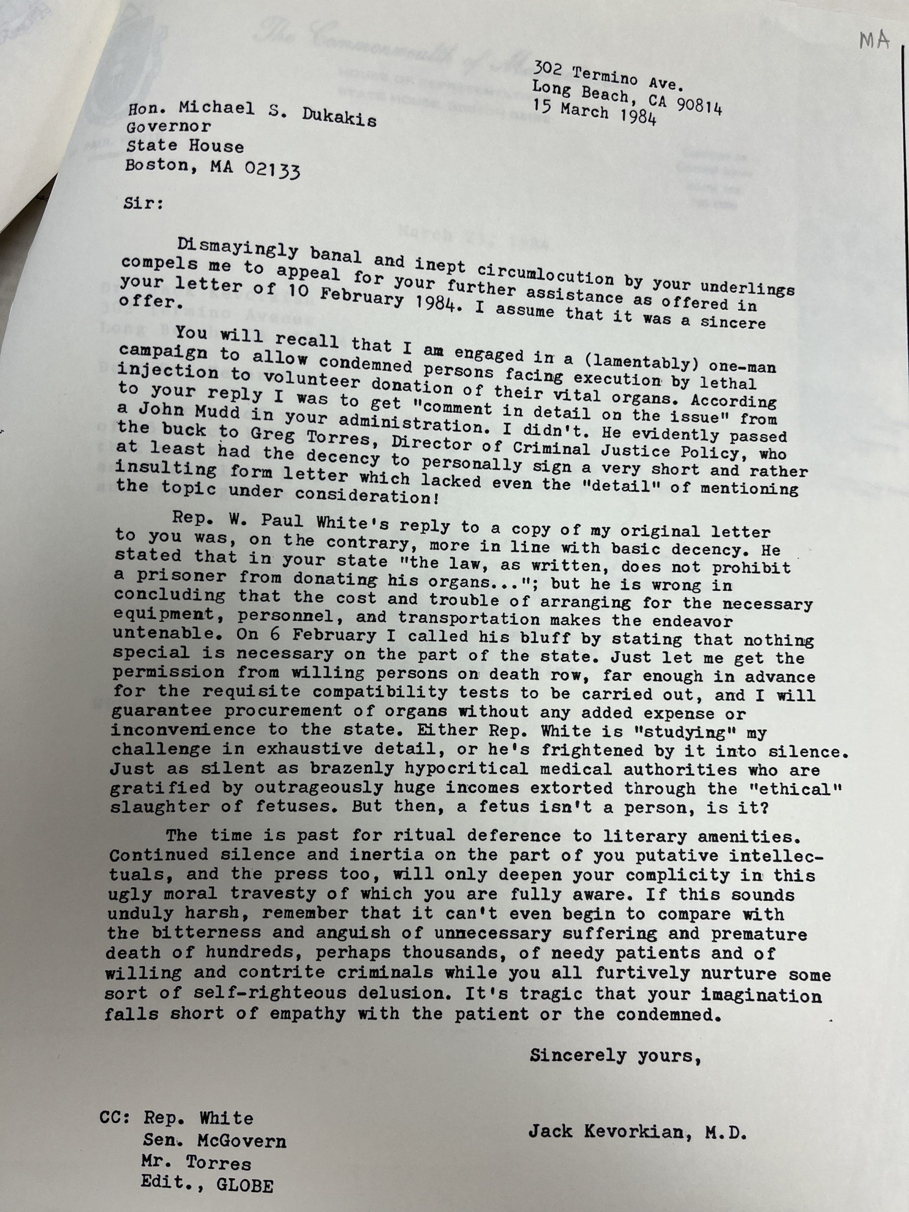 “Dismayingly banal and inept circumlocution by your underlings compels me to appeal for your further assistance,” Kevorkian wrote to Dukakis. “I assume that it was a sincere offer.”