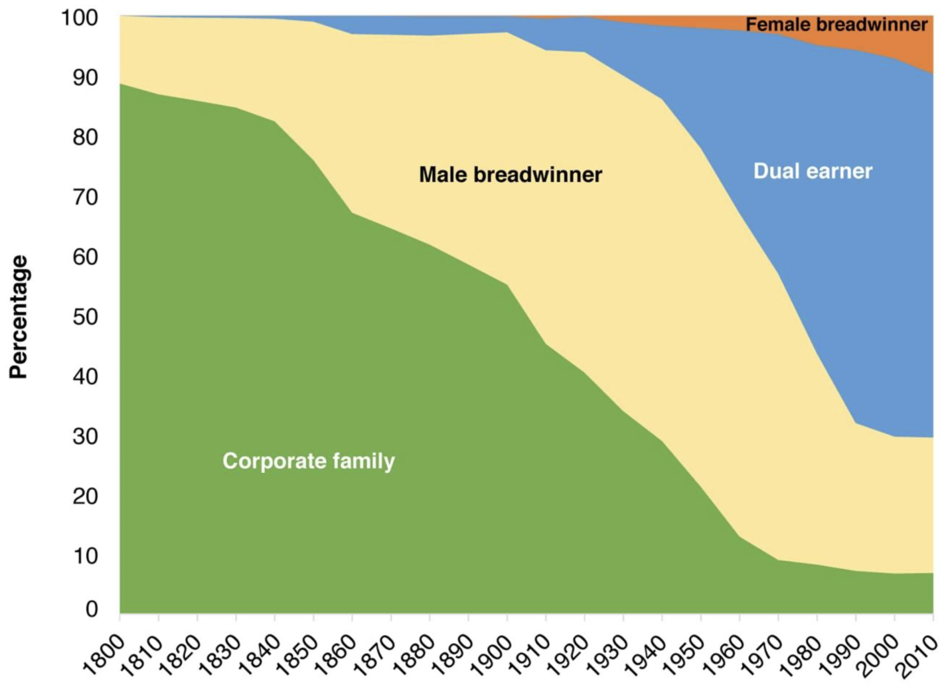 Matters started to change during the Industrial Revolution, when dramatic shifts in the means of production swept across the Western world. The advent of the steam engine, of railways and steamships and power looms, brought changes to nearly every aspect of society, from the jobs people held to the places and social structures in which they lived. Marriage was no exception. As the growth of the manufacturing economy pulled generations of agricultural laborers off the fields and onto factory floors, the extended families that had long prevailed across Europe were gradually replaced by what we now consider nuclear families. Family sizes began to shrink, and men who had once worked side by side with their wives and children increasingly left home each day to join the growing urban labor force. Some of this shift was occasioned by changing social mores and the greater incomes that industrialization eventually provided even to the working class. But much, too, was a direct result of the specific technologies of this age: heavier machinery prized higher levels of upper body strength, giving men a general advantage in the factory and relegating women to more domestic spheres.