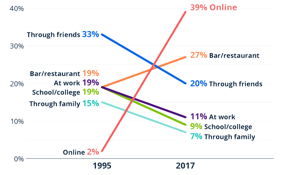 And then came Tinder and a bevy of other apps for dating, mating, and just plain sex. Grindr, Match, Hinge, Bumble — they all promised an infinity of well-curated choices, pre-configured to give you who you wanted, when you wanted, and wherever you happened to be. And to a large extent they did: between 1995 and 2017, the share of heterosexual couples who met online surged from 2 percent to nearly 40. Young people who had once relied on a church social or freshman English class to proffer up a date turned now to their phones instead. So did many older people, who found themselves alone later in life, realizing — to their dismay, confusion, or occasionally even delight — that the norms they had mastered or at least muddled through in their youth no longer applied.