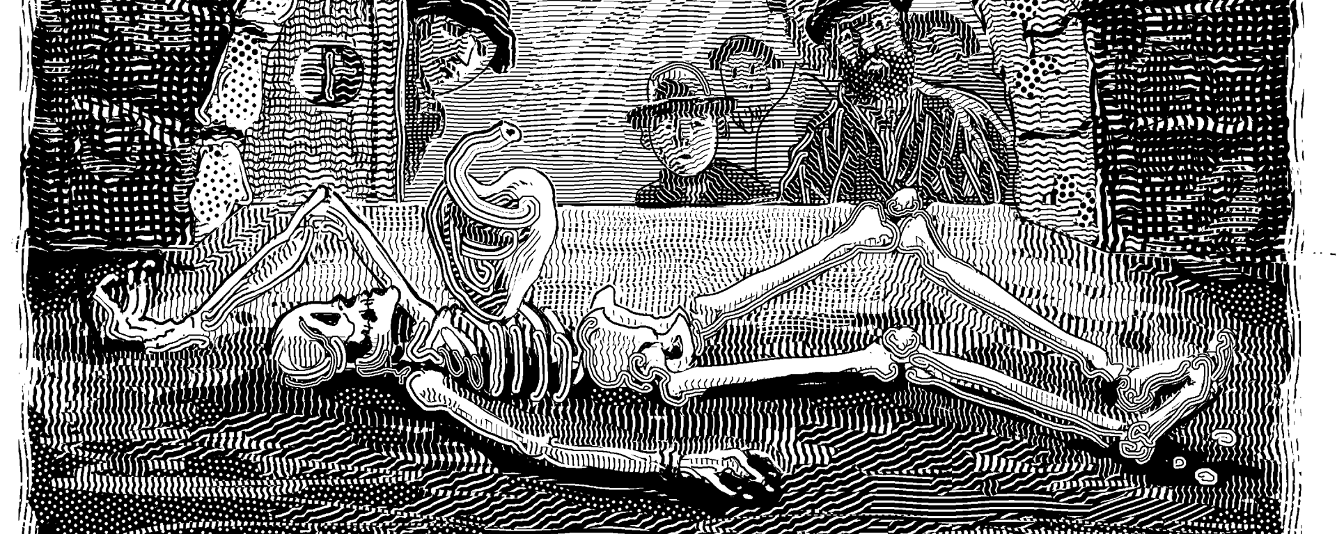 So little Joe ran up the hillock, and stood by his father’s side. The marble was all burnt into perfect, snow-white lime. But on its surface, in the midst of the circle, — snow-white too, and thoroughly converted into lime, — lay a human skeleton, in the attitude of a person who, after long toil, lies down to long repose. Within the ribs — strange to say — was the shape of a human heart. |