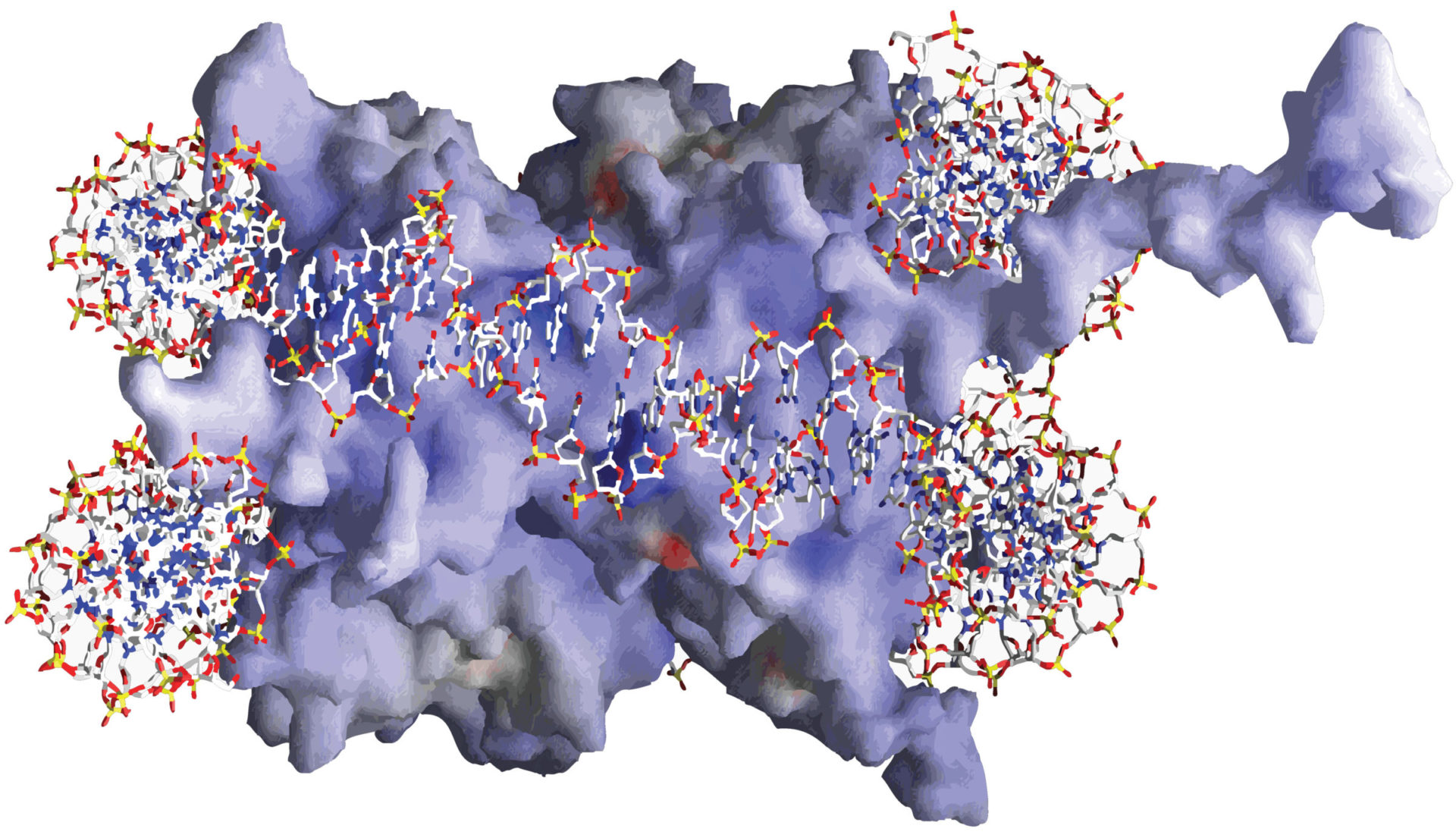 The influence of form works in the other direction as well: the bound protein can transform the shape of DNA in a decisive way, making it easier for a second protein to bind nearby, even without any direct protein-protein interactions. In the case of one gene relating to the production of interferon (an important constituent of the immune system), “eight proteins modulate [DNA] binding site conformation and thereby stabilize cooperative assembly without significant contribution from interprotein interactions.”[12] As a result of this intricate cooperation of proteins and DNA, mediated by the shifting structure of the double helix, the cell achieves proper expression of the interferon gene according to its needs.