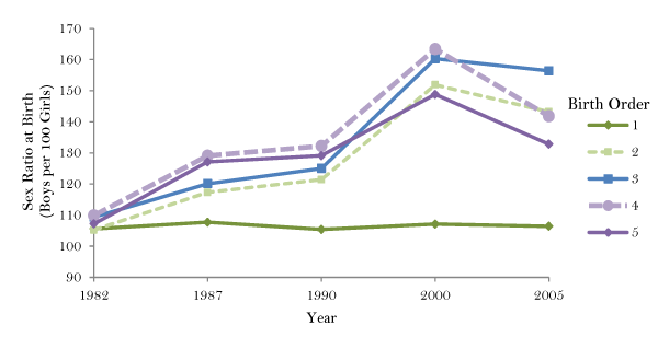 Though Western sensibilities may be inclined to attribute the national embrace of mass female feticide to “backward” thinking in China, important basic facts are uncomfortably inconsistent with that proposition. For one thing, abnormal sex ratios appear to be almost entirely a Han phenomenon within China — and China’s Han are, generally speaking, better educated and more affluent than the country’s non-Han minorities. Second, although SRBs are lower in urban than in rural China, these differences may have less to do with education and income than with fertility levels. After all, fertility levels are decidedly lower in urban than in rural China, meaning that a smaller proportion of babies born in China’s cities are higher-parity births, which tend in China to be overwhelmingly male. Third, China has enjoyed a historically extraordinary surge of development and prosperity over the very years that SRBs and child sex ratios have been rising. Between the 1982 census and the 2005 mini-census, China’s reported adult (15 and older) female illiteracy rate dropped from 25 percent to 4 percent, and mean years of schooling for Chinese women rose by nearly 50 percent over roughly that same period, from 5.4 to 8.0. Moreover, China’s estimated per capita income jumped nearly fivefold between 1982 and 2005, while the fraction of the population living in extreme poverty (as defined by the World Bank) plummeted from roughly 75 percent in 1981 to roughly 15 percent in 2004. Despite continuing political restrictions and state-administered censorship, China is also vastly more open to the outside world today than it was in the early 1980s (as attested by statistics on everything from international trade, investment, and finance to travel and communications). China’s increasingly unnatural sex ratios for babies and children and its growing army of “missing girls” must therefore be regarded as a feature — indeed, a defining feature — of so-called “globalization with Chinese characteristics.” (Note, incidentally, that Beijing outlawed prenatal sex determination in 1989, and criminalized sex-selective abortion in 2004 — yet these legal strictures have obviously been ineffective despite the Chinese state’s considerable police powers.)