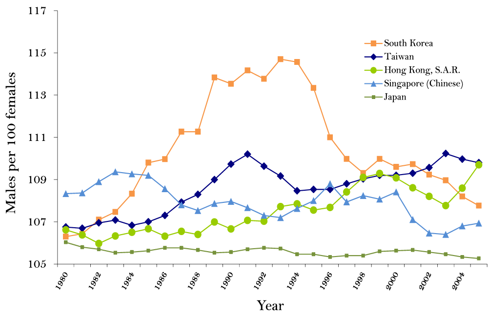 One commonality to China and the four Little Dragons is a Confucian cultural heritage, which places an imperative on continuing a family’s lineage through the male heir as a metaphysical key to greater universal harmony and virtue. It is noteworthy that Japan — an East Asian society without a strong Confucian tradition, but with easy access to abortion and obstetric ultrasonography and with very low fertility rates, just as in China and the four Little Dragons — has always reported a sex ratio at birth well within human biological norms.