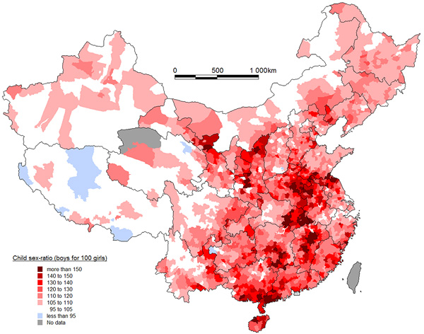 Chinese census data outline the basic geo-demography of China’s imbalanced sex ratios at birth. For the country as a whole, SRBs since 1982 have consistently been lowest for China’s cities, and highest for rural areas; in the 2005 mini-census, reported SRBs were roughly 123 for rural areas, 120 for towns, and 115 for cities. But there are major SRB variations within China at the regional level; as of 2005, only three provinces reported essentially “normal” SRBs, while many more reported SRBs of 125 or more, with two provinces reporting levels in excess of 130 (see Figure 1). The geography of China’s gender imbalance is further highlighted by a county-level breakout of sex ratios for young children in the year 2000 (see Figure 2, below). As may be seen, sex ratios are essentially “normal” (105 or lower) in much of Western China and along parts of the country’s northern border — areas where non-Han ethnic minorities predominate — while unnatural gender imbalances characterize virtually the entirety of the Han-majority areas in China’s east and south. There are tremendous variations in the extremity of the condition within this Han expanse: a number of inland and coastal areas stand out as epicenters of the problem, and are marked by concentrations of counties, each encompassing millions or tens of millions of people, wherein child sex ratios of 150 or greater prevail. Demographers Christophe Z. Guilmoto and Sébastien Oliveau describe these radical-imbalance areas as “hot spots” — and since the phenomenon has spread across China’s population over the past three decades, Figure 2 may be regarded as the map of mounting national casualties.