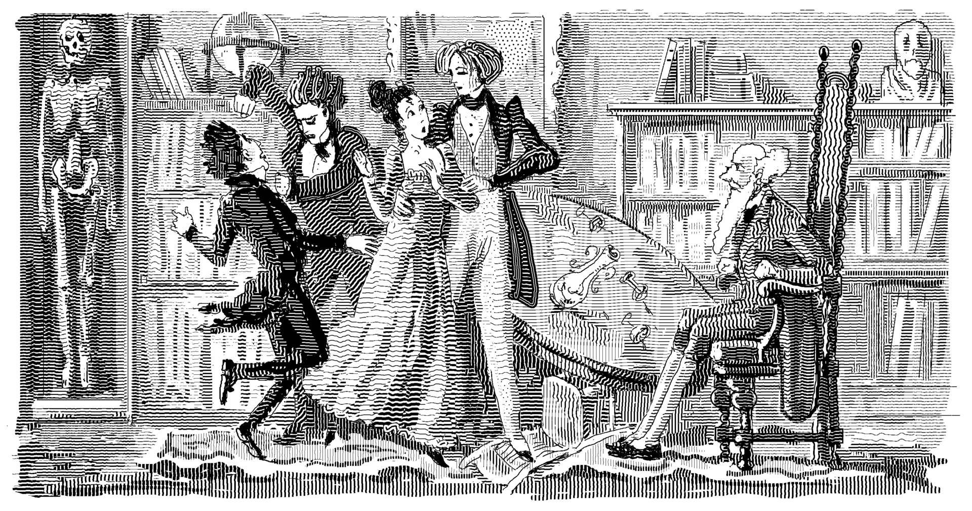 As they grow younger still, the elixir unleashes the latent impulses of these unrepentants. Finally noticing each other, regressing from solipsism to selfishness, they bounce around the room together, callously mocking the still-ancient Dr. Heidegger, afflicted with “the infirmity and decrepitude of which they had so lately been the victims.” The men each play to type as they try to win Clara for a dance. The warrior issues an order: “Dance with me, Clara!” The politician pulls rank: “No, no, I will be her partner!” The merchant invokes contract: “She promised me her hand, fifty years ago!” Mirth turns to madness: A playful scuffle for the lady soon becomes a fight, as they renew their near-murderous competition for the now-restored beauty. “Yet, by a strange deception, owing to the duskiness of the chamber, and the antique dresses which they still wore, the tall mirror is said to have reflected the figures of the three old, gray, withered grandsires, ridiculously contending for the skinny ugliness of a shrivelled grandam.”