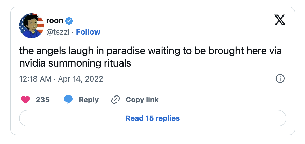 And yet the discourse around the Shoggoth eerily evokes the idea of worship, with statements that are deliberately ambiguous about whether they’re jokes. Perhaps they are, like our new president, best taken seriously but not literally. For example: