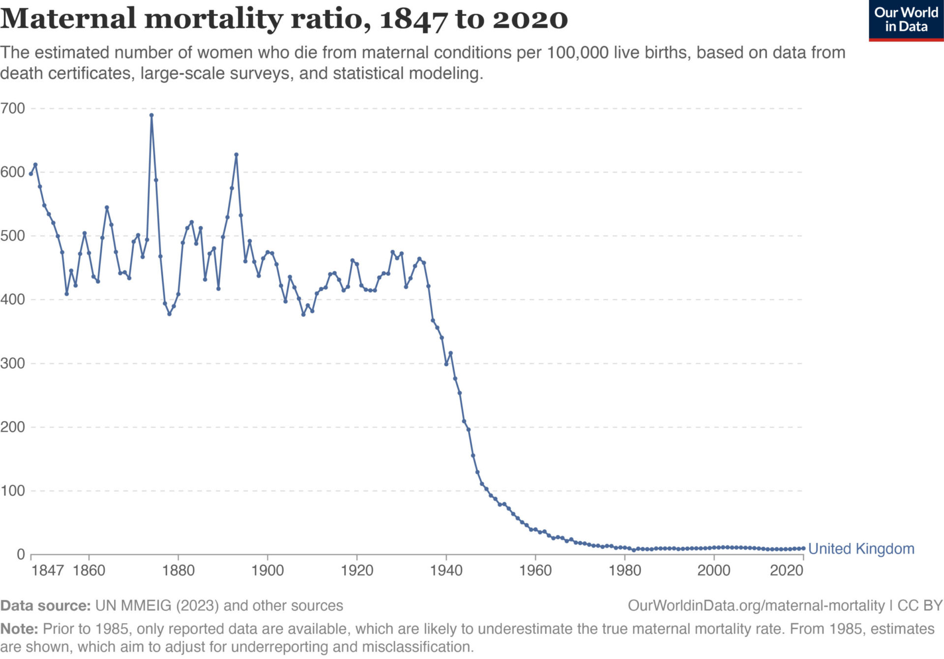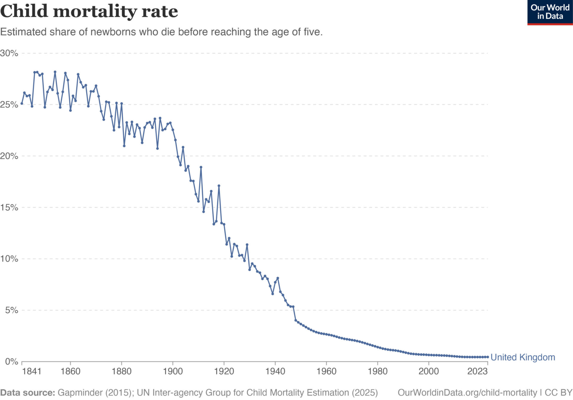 The charts show the fall in the number of British women who die during pregnancy or childbirth and the number of British children who die before the age of five. I chose Britain because it has unusually good records, but similar (if sometimes smaller) long-term declines have occurred all over the world. One would have to be extraordinarily cynical not to conclude from these charts that in fundamental ways life has gotten better.